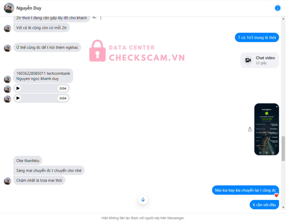 Scammer Alert: Nguyễn Ngọc Khánh Duy Reported: November 16, 2024 Scammer Information Full Name: Nguyễn Ngọc Khánh Duy Payment Gate: Techcombank Payment Account: 19036228085011 Category: Marketplace scams Source: Checkscam Evidence Files Report Description lừa mượn tiền rồi sủi ;)) Comments Your comment Add Comment No comments yet. Be the first to share your experience with this scammer.