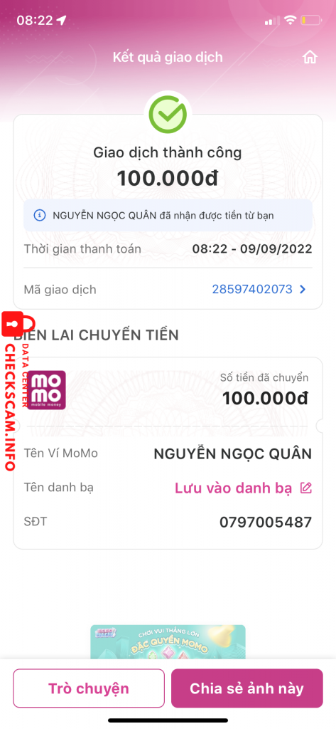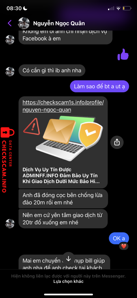 Scammer Alert: Nguyễn Ngọc Quân Reported: November 16, 2024 Scammer Information Full Name: Nguyễn Ngọc Quân Payment Gate: Mbbank Payment Account: 033333313 Category: Marketplace scams Source: Checkscam Evidence Files Report Description Ad đóng 20m lên checkscam1s sao lại đi scam Comments Your comment Add Comment No comments yet. Be the first to share your experience with this scammer.