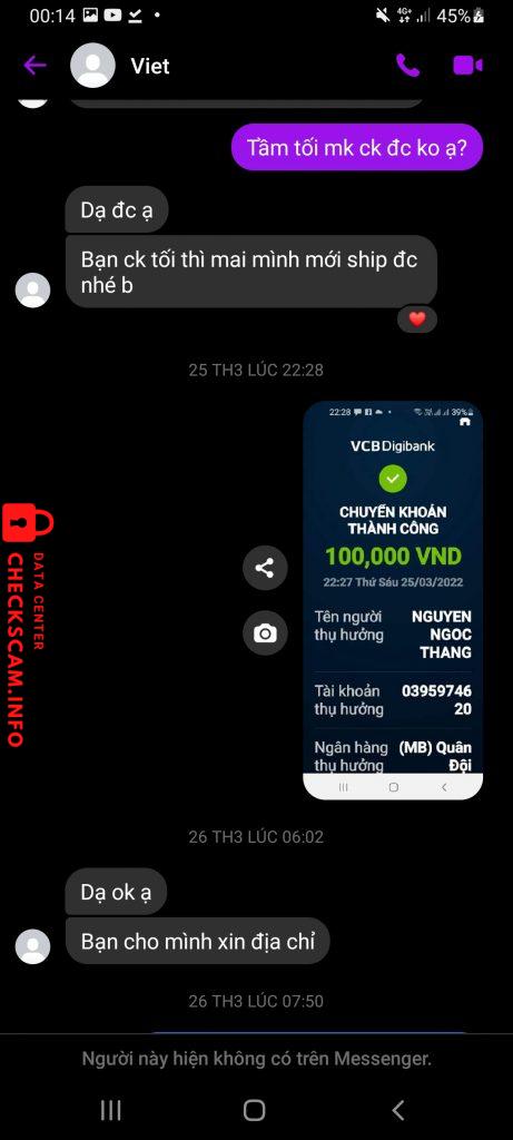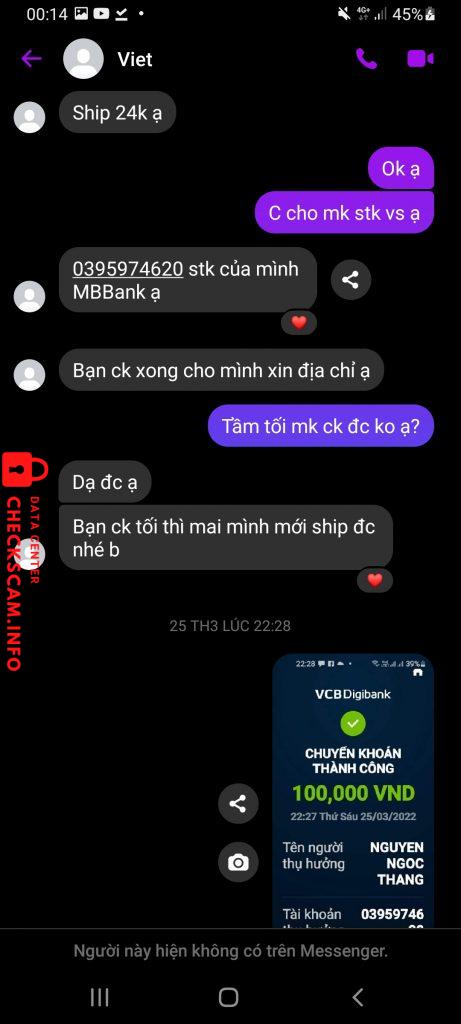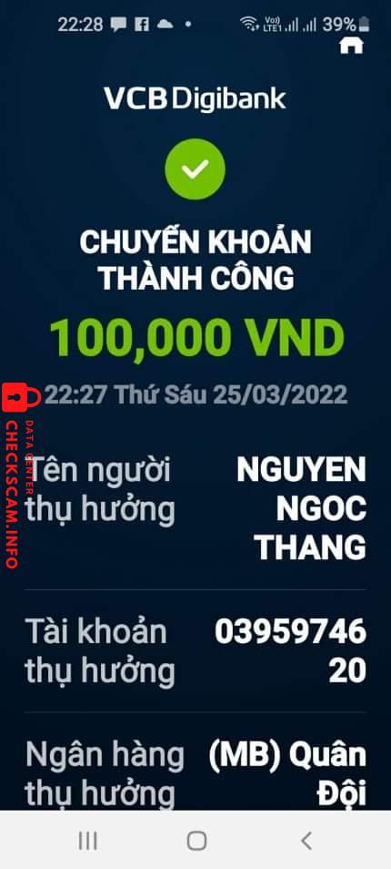 Scammer Alert: Nguyen Ngoc Thang Reported: November 16, 2024 Scammer Information Full Name: Nguyen Ngoc Thang Payment Gate: MB bank Payment Account: 0395974620 Category: Marketplace scams Source: Checkscam Evidence Files Report Description Scam t kny 20 đb 100k. Lúc đầu thấy tngd chụp đúng thời gian đang nhắn thì cx tin đây ? đcm m scam cái đ j Comments Your comment Add Comment No comments yet. Be the first to share your experience with this scammer.