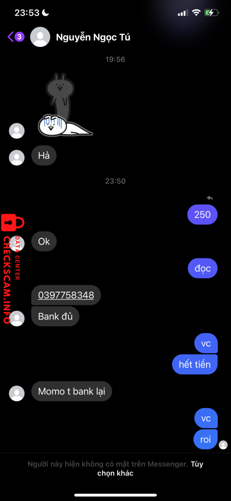 Scammer Alert: Nguyễn Ngọc Tú Reported: November 16, 2024 Scammer Information Full Name: Nguyễn Ngọc Tú Phone Number: 0397758348 Payment Gate: MOMO Payment Account: 0397758348 Category: Marketplace scams Source: Checkscam Evidence Files Report Description Lừa Đảo 240k Comments Your comment Add Comment No comments yet. Be the first to share your experience with this scammer.