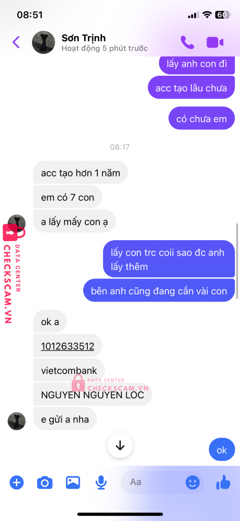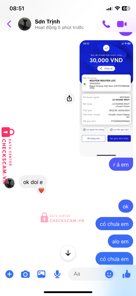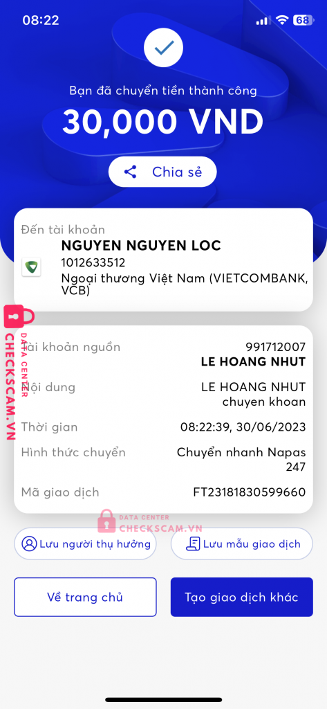 Scammer Alert: NGUYEN NGUYEN LOC Reported: November 16, 2024 Scammer Information Full Name: NGUYEN NGUYEN LOC Payment Gate: Vietcombank Payment Account: 1012633512 Category: Marketplace scams Source: Checkscam Evidence Files Report Description mn có mua tk shopee lưu ý né bạn này ra Comments Your comment Add Comment No comments yet. Be the first to share your experience with this scammer.