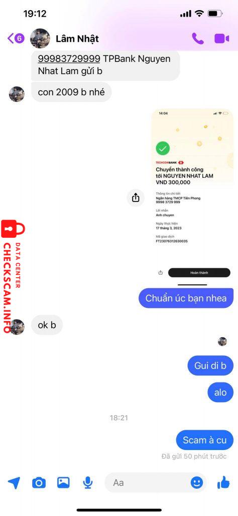 Scammer Alert: NGUYEN NHAT LAM Reported: November 16, 2024 Scammer Information Full Name: NGUYEN NHAT LAM Payment Gate: TP BANK Payment Account: 99983729999 Category: Marketplace scams Source: Checkscam Evidence Files Report Description lừa đảo mua bán FACEBOOK Comments Your comment Add Comment No comments yet. Be the first to share your experience with this scammer.