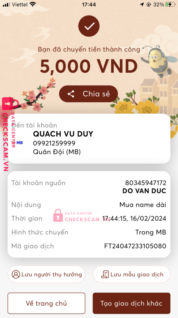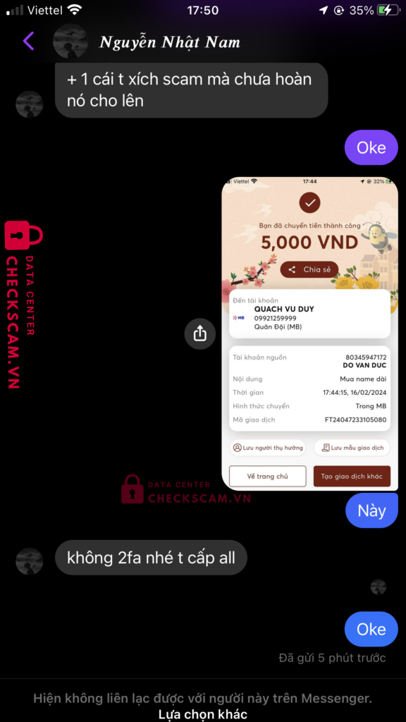 Scammer Alert: Nguyễn Nhật Nam Reported: November 16, 2024 Scammer Information Full Name: Nguyễn Nhật Nam Payment Gate: MBank Payment Account: 09921259999 Category: Marketplace scams Source: Checkscam Evidence Files Report Description Ae lưu ý với thk này nhé Comments Your comment Add Comment No comments yet. Be the first to share your experience with this scammer.