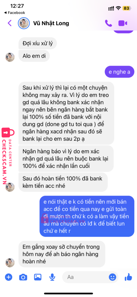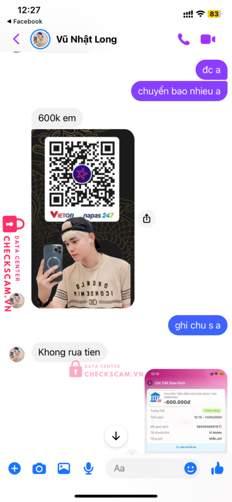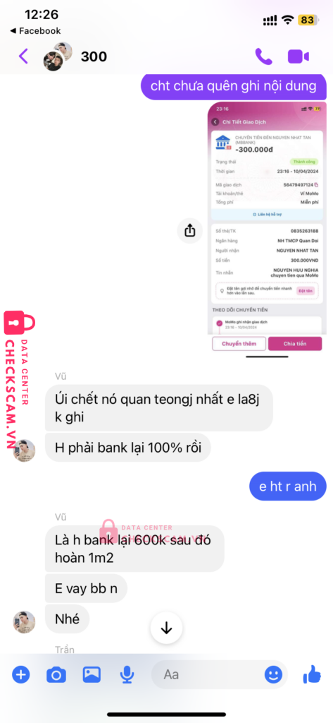 Scammer Alert: nguyen nhat tan Reported: November 16, 2024 Scammer Information Full Name: nguyen nhat tan Payment Gate: mb bank Payment Account: 0835263188 Category: Marketplace scams Source: Checkscam Evidence Files Report Description kêu mình gửi 300k để xác nhận k rửa tiền mk chuyển r lại kêu chuyển nữa Comments Your comment Add Comment No comments yet. Be the first to share your experience with this scammer.