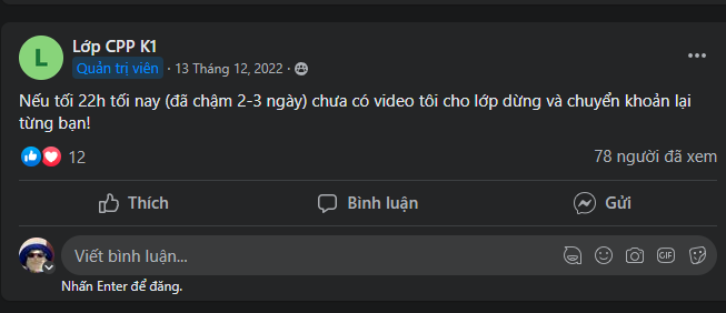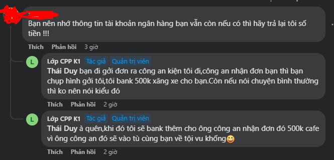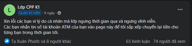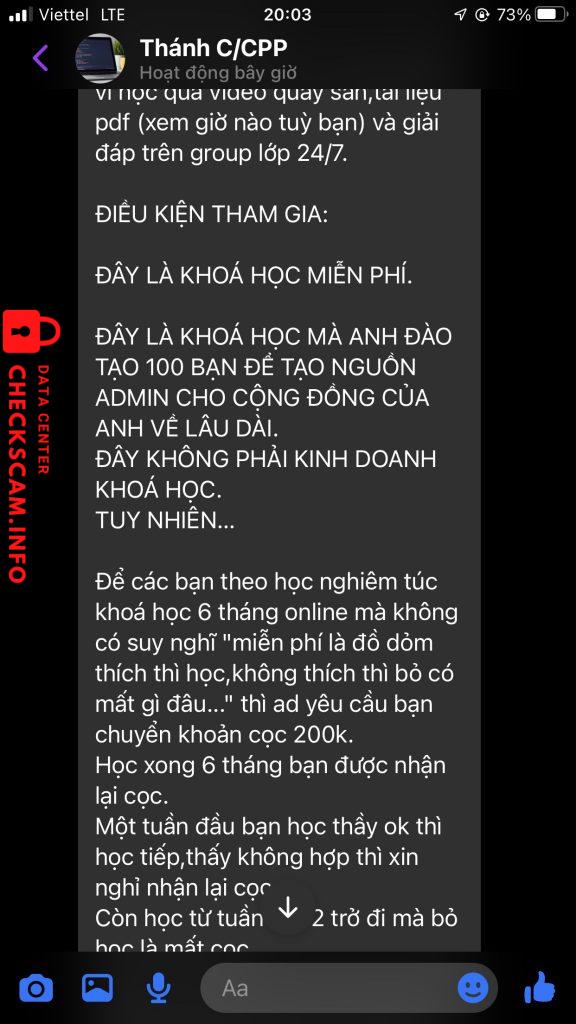 tạo nhóm lập trình fake(100k thành viên) bán khóa học FREE nhưng bắt cọc. từ lúc bắt đầu “học” (5/12/2022) đến giờ đã 3 tháng. Cò quay không chịu trả tiền. Nó còn đang tính tạo thêm nhóm học “tiếng anh it” với quy mô 1000 người và bắt những người đóng tiền cọc khóa học lập trình(5/12/2022) phải vào group, theo học đến cuối năm mới trả tiền. Có tầm 200 người tham gia các khóa học lập trình C và C++ của nó từ ngày 5/12/2022.