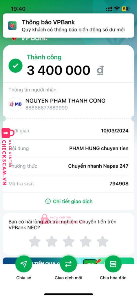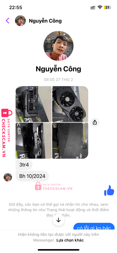 Scammer Alert: Nguyen Phạm Thanh Cong Reported: November 16, 2024 Scammer Information Full Name: Nguyen Phạm Thanh Cong Payment Gate: MB bank Payment Account: 88866677889999 Category: Marketplace scams Source: Checkscam Evidence Files Report Description tôi mua vga và ck trước.?? Comments Your comment Add Comment No comments yet. Be the first to share your experience with this scammer.