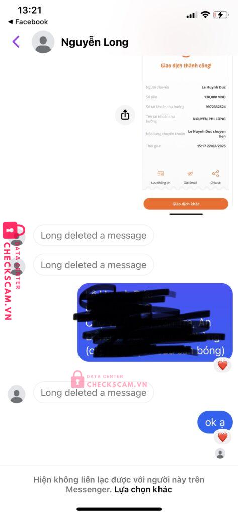 Scammer Alert: nguyen phi long Reported: March 7, 2025 Scammer Information Full Name: nguyen phi long Payment Gate: viet com bank Payment Account: 9972332524 Category: Marketplace scams Source: Checkscam Evidence Files Report Description Người này đăng bài bán hàng nhưng sau khi ck tiền thì chặn fb Comments Your comment Add Comment No comments yet. Be the first to share your experience with this scammer.