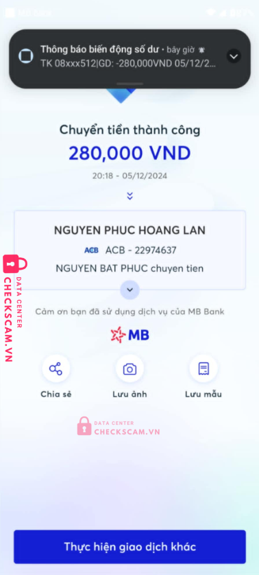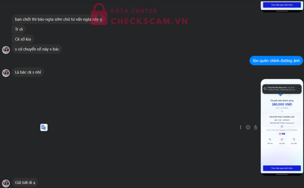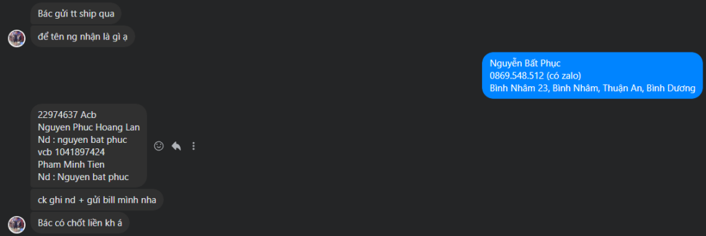 Scammer Alert: Nguyen Phuc Hoang Lan Reported: March 7, 2025 Scammer Information Full Name: Nguyen Phuc Hoang Lan Payment Gate: ACB Payment Account: 22974637 Category: Marketplace scams Source: Checkscam Evidence Files Report Description Lừa cọc rất tinh vi, ăn nói rất khéo léo tưởng như thật. Nó sẽ làm sao cho mình phải chuyển 2 lần vào 2 số tài khoản của nó. Đổi tên fb rất nhiều Comments Your comment Add Comment No comments yet. Be the first to share your experience with this scammer.