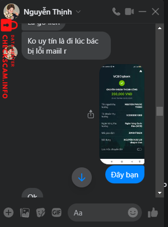 Scammer Alert: Nguyen Phuoc Thinh Reported: November 16, 2024 Scammer Information Full Name: Nguyen Phuoc Thinh Payment Gate: NCB Payment Account: 103000001000 Category: Marketplace scams Source: Checkscam Evidence Files Report Description Lừa đảo bán acc cho nhiều nguời Comments Your comment Add Comment No comments yet. Be the first to share your experience with this scammer.