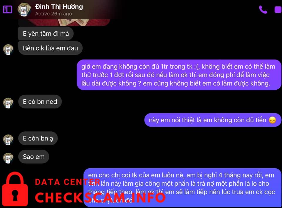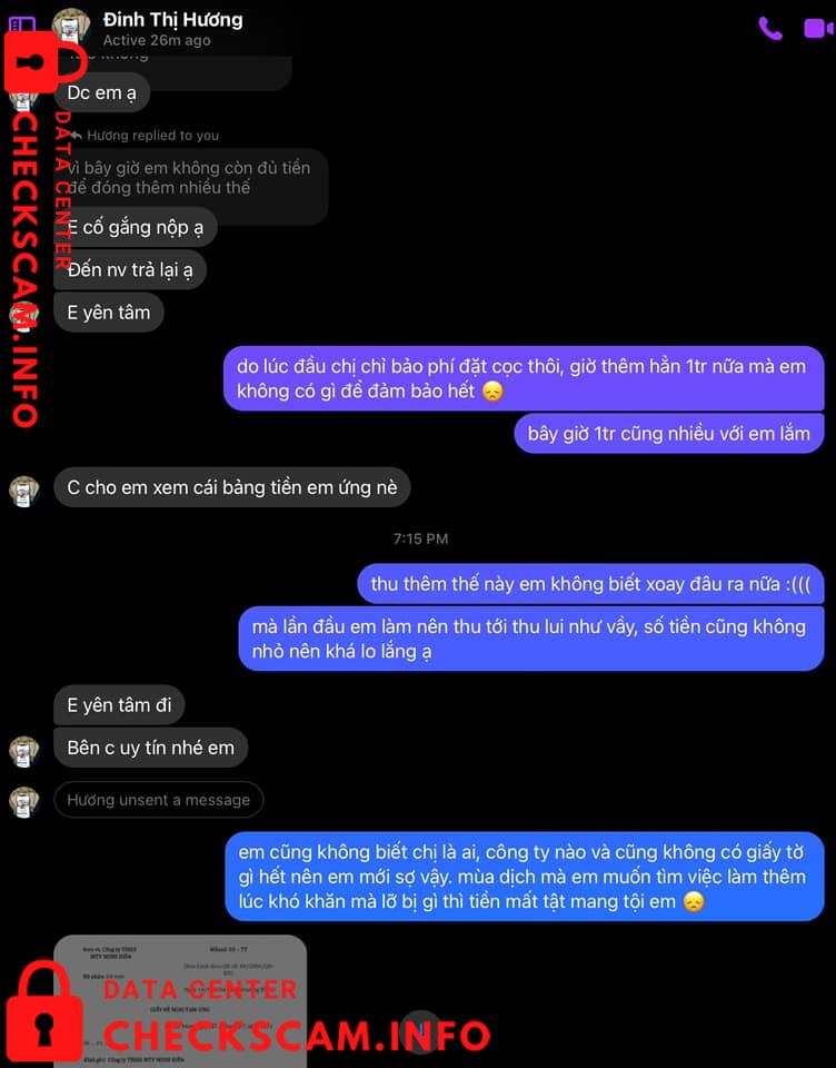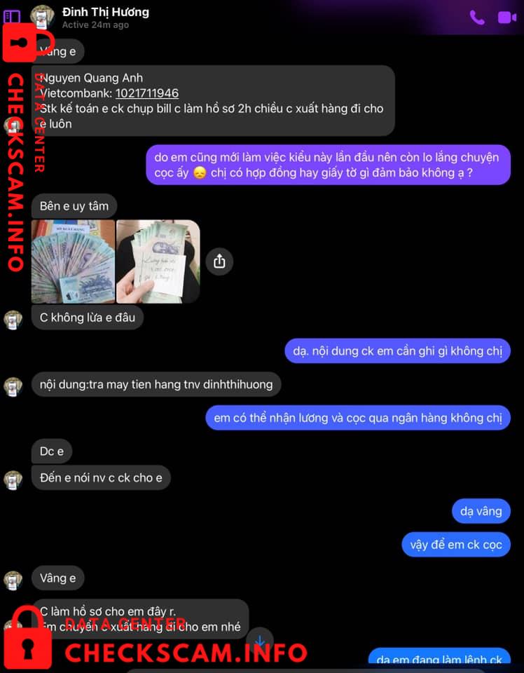 Thời buổi dịch khó khăn đủ đường, mình muốn tìm công việc nào đó để làm thêm cho có thu nhập thì gặp ngay quả lừa đảo. Lúc đầu mình chưa tỉnh táo để nhận ra sự việc nên cũng đã chuyển cọc để nhận hàng. Nhưng thủ đoạn ở đây là sau khi nhận tiền, vào tiếng sau mới báo “e là có phát sinh phí” các kiểu. Tới đoạn này là mình bừng tỉnh rồi. Mình đi tra thông tin và phát hiện ra cả ổ lừa đảo được đăng tràn lan trên các trang tìm việc làm. Nội dung công việc giống nhau, cách dụ dỗ bài bản giống nhau ( mình đã nhắn tin cho một vài acc có đăng tin tương tự để test ), cách đòi tiền, hối nộp tiền y như nhau, hình ảnh và nội dung cmt khen việc uy tín này nọ lọ chai toàn là giả…