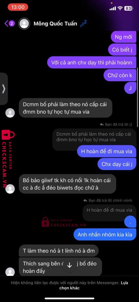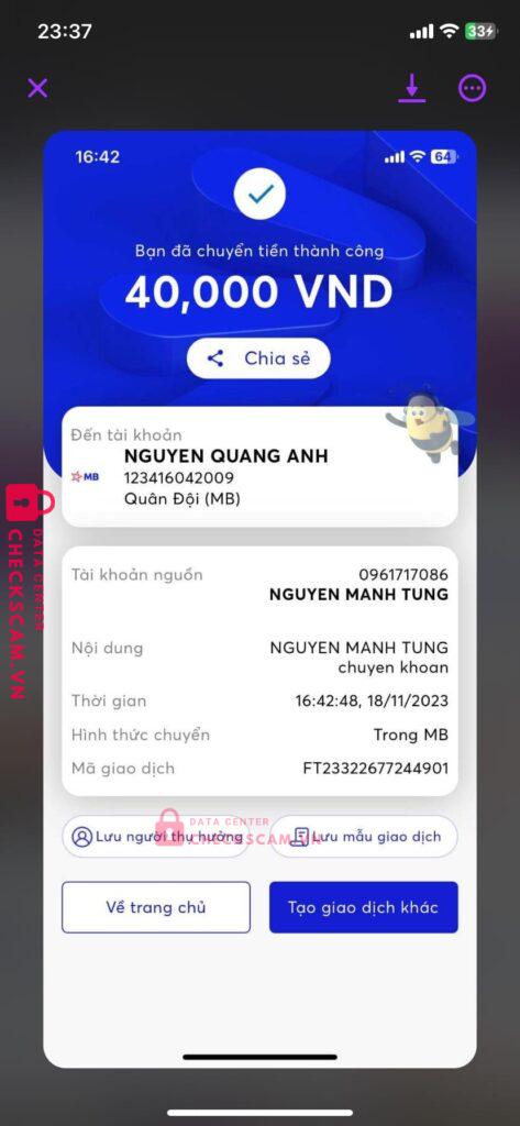 Scammer Alert: Nguyen Quang Anh Reported: November 16, 2024 Scammer Information Full Name: Nguyen Quang Anh Payment Gate: mb bank Payment Account: 123416042009 Category: Marketplace scams Source: Checkscam Evidence Files Report Description dạy dame acc và unl acc bank đủ tiền bảo dạy không dạy dame lúc báo hòan tiền thì nó không hoàn còn block Comments Your comment Add Comment No comments yet. Be the first to share your experience with this scammer.
