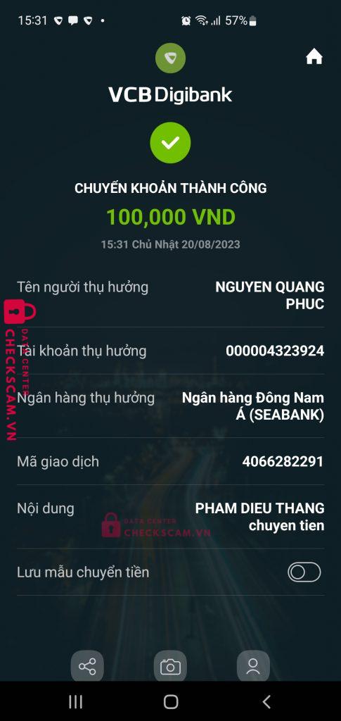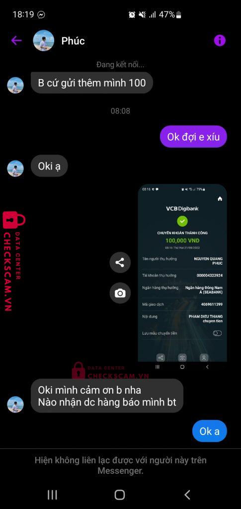 Scammer Alert: NGUYEN QUANG PHUC Reported: November 16, 2024 Scammer Information Full Name: NGUYEN QUANG PHUC Payment Gate: SEABANK Payment Account: 000004323924 Category: Marketplace scams Source: Checkscam Evidence Files Report Description Lừa cọc tiền Comments Your comment Add Comment No comments yet. Be the first to share your experience with this scammer.