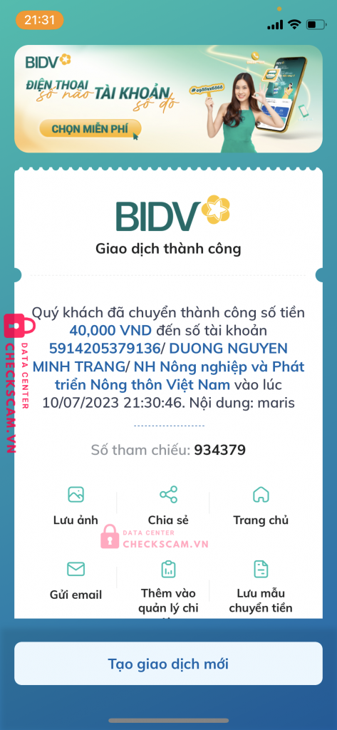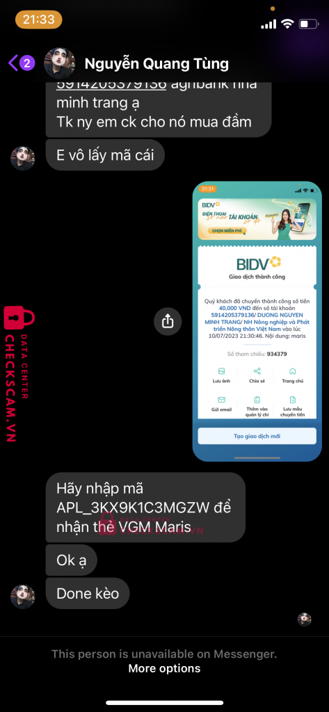 Scammer Alert: Nguyễn Quang Tùng Reported: November 16, 2024 Scammer Information Full Name: Nguyễn Quang Tùng Payment Gate: Agribank Payment Account: 5914205379136 Category: Marketplace scams Source: Checkscam Evidence Files Report Description Lừa đảo bán sai đồ ! Comments Your comment Add Comment No comments yet. Be the first to share your experience with this scammer.