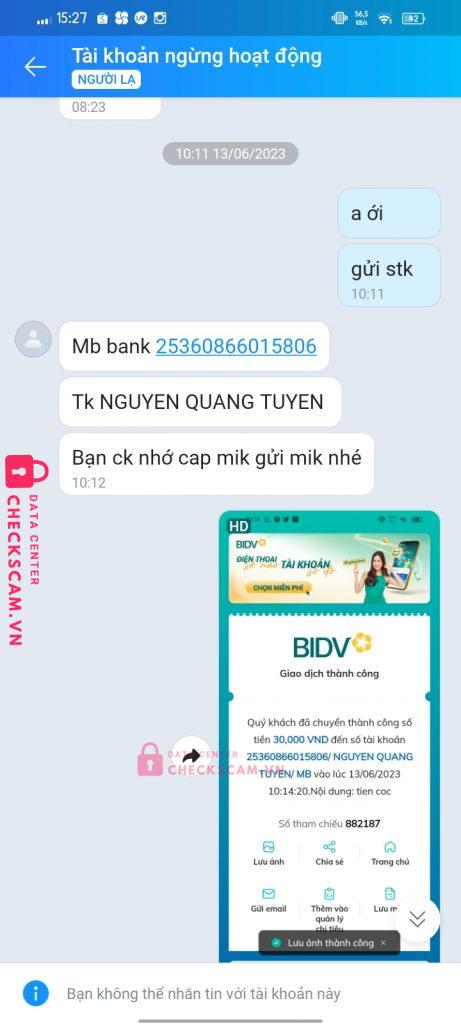 Scammer Alert: NGUYEN QUANG TUYEN Reported: November 16, 2024 Scammer Information Full Name: NGUYEN QUANG TUYEN Payment Gate: MB BANKS Payment Account: 25360866015806 Category: Marketplace scams Source: Checkscam Evidence Files Report Description Lừa đảo học sinh mua tài liệu xong scam Comments Your comment Add Comment No comments yet. Be the first to share your experience with this scammer.
