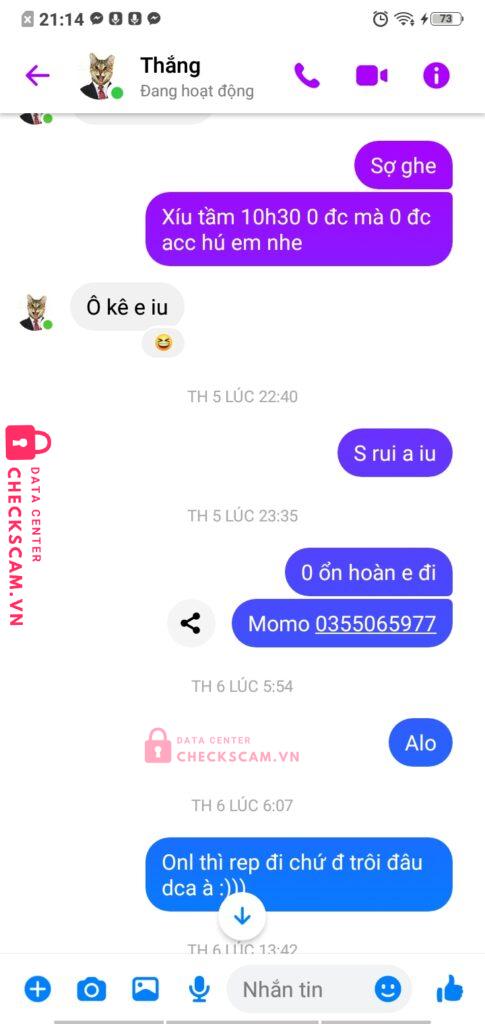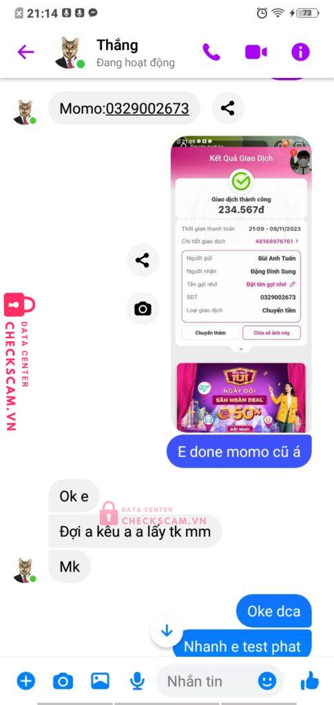 Scammer Alert: Nguyen Quoc Dung Reported: November 16, 2024 Scammer Information Full Name: Nguyen Quoc Dung Payment Gate: Mbbank Payment Account: 0363729723 Category: Marketplace scams Source: Checkscam Evidence Files Report Description Thằng này chơi trò tạo ev lụm acc xong đến kèo cao cao tí là trốn Comments Your comment Add Comment No comments yet. Be the first to share your experience with this scammer.