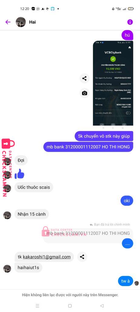 Scammer Alert: NGUYEN QUOC HUY Reported: November 16, 2024 Scammer Information Full Name: NGUYEN QUOC HUY Payment Gate: Mb Bank Payment Account: 5554347777 Category: Marketplace scams Source: Checkscam Evidence Files Report Description Mua Acc Xong Gửi tk mk không đúng vào hỏi xem thì thấy chặn ?? Comments Your comment Add Comment No comments yet. Be the first to share your experience with this scammer.