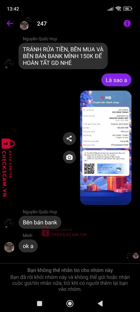 Scammer Alert: NGUYEN QUOC HUY Reported: November 16, 2024 Scammer Information Full Name: NGUYEN QUOC HUY Payment Gate: MB BANK Payment Account: 44566000123 Category: Marketplace scams Source: Checkscam Evidence Files Report Description Gdtg acc bank tiền hết 400k hoàn acc k thấy bank lại Comments Your comment Add Comment No comments yet. Be the first to share your experience with this scammer.