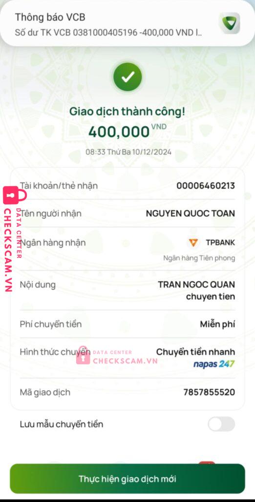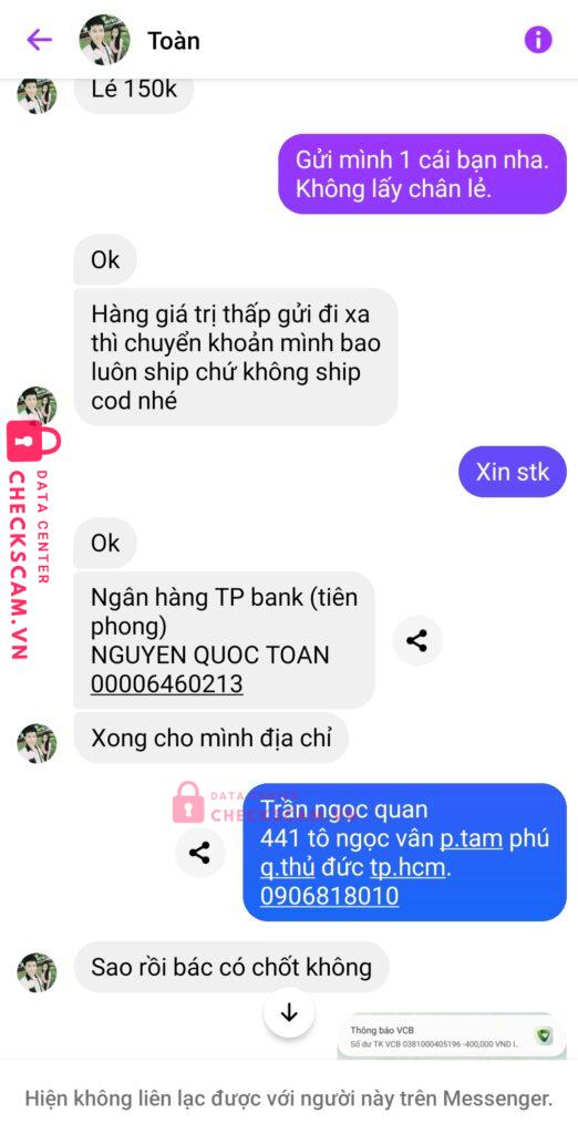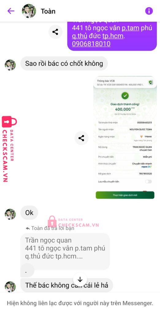 Scammer Alert: Nguyen quoc toan Reported: March 7, 2025 Scammer Information Full Name: Nguyen quoc toan Payment Gate: Tiên phong tp bank Payment Account: 00006460213 Category: Marketplace scams Source: Checkscam Evidence Files Report Description Chuyển khoản không gửi hàng xóa nick Comments Your comment Add Comment No comments yet. Be the first to share your experience with this scammer.