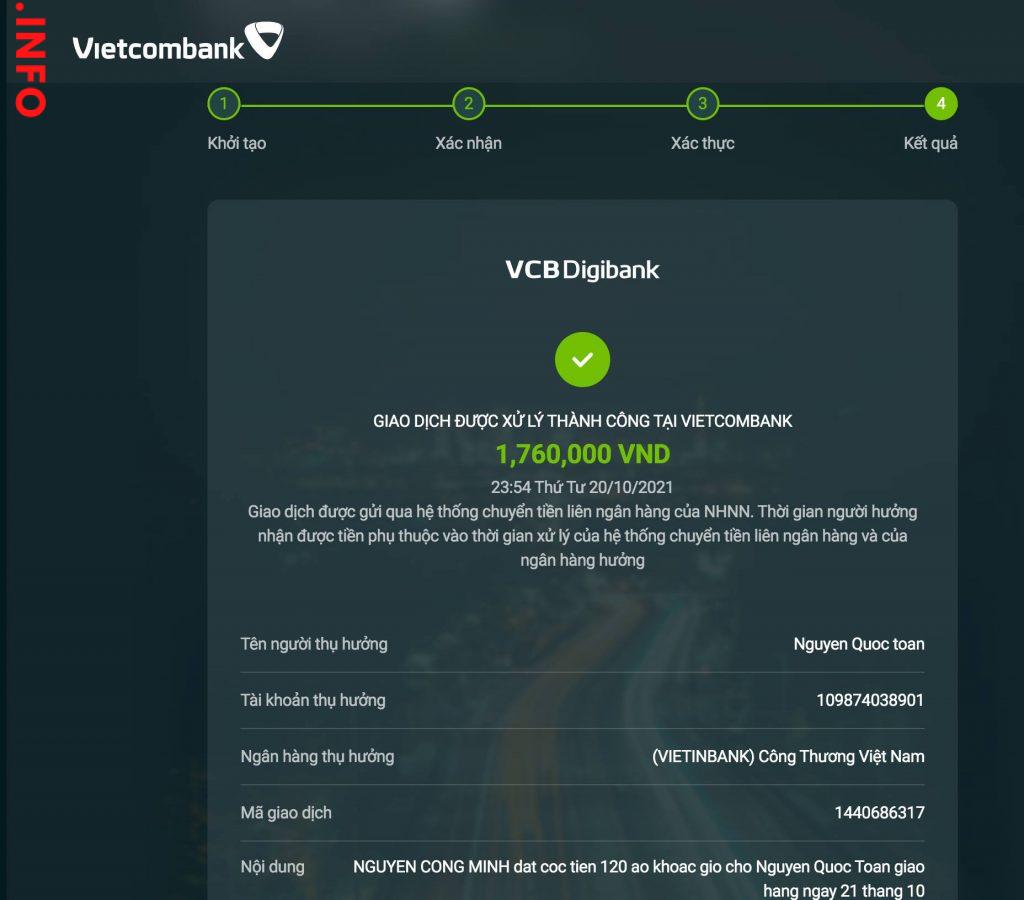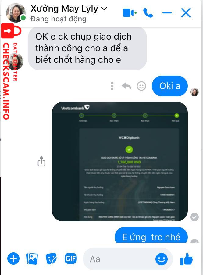 Tối ngày hôm qua e có chuyển khoản để cọc tiền hàng sản xuất áo nhưng bị đối tượng này lừa và đến sáng nay thì không liên lạc được với đối tượg lừa đảo.