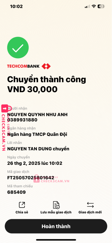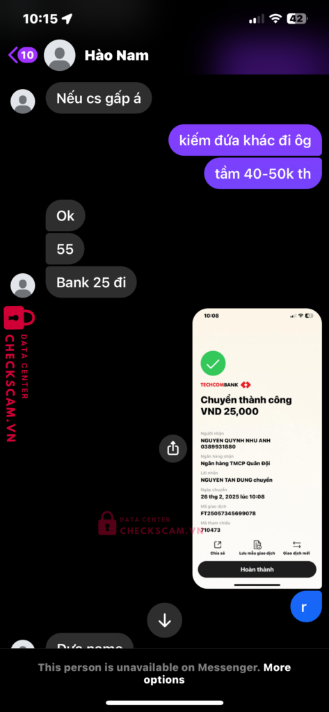 Scammer Alert: NGUYEN QUYNH NHU ANH Reported: March 7, 2025 Scammer Information Full Name: NGUYEN QUYNH NHU ANH Payment Gate: MB BANK Payment Account: 0389931880 Category: Marketplace scams Source: Checkscam Evidence Files Report Description scam 55k block Comments Your comment Add Comment No comments yet. Be the first to share your experience with this scammer.