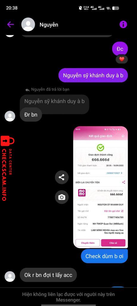 Scammer Alert: Nguyễn sỹ khánh duy Reported: November 16, 2024 Scammer Information Full Name: Nguyễn sỹ khánh duy Payment Gate: Mb bank Payment Account: 778877456789 Category: Marketplace scams Source: Checkscam Evidence Files Report Description Thanh niên này lừa của mình 666k mua acc free frie và mất tiêu mong check scam xem xét Comments Your comment Add Comment No comments yet. Be the first to share your experience with this scammer.