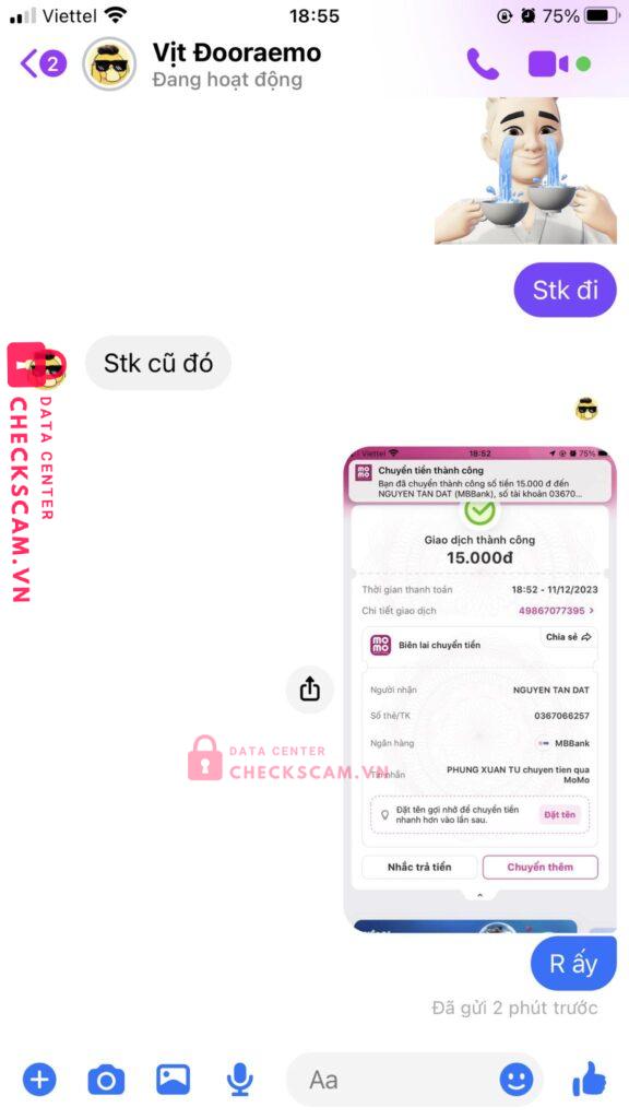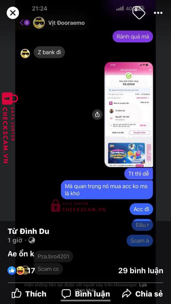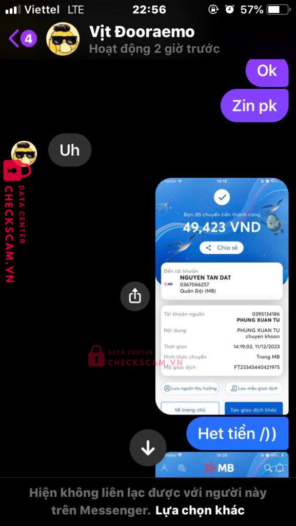 Scammer Alert: Nguyễn Tấn Đạt Reported: November 16, 2024 Scammer Information Full Name: Nguyễn Tấn Đạt Payment Gate: mb (quân đội) Payment Account: 0367066257 Category: Marketplace scams Source: Checkscam Evidence Files Report Description lúc đầu tạo uy tín 1 thời gian sau quay ra scam Comments Your comment Add Comment No comments yet. Be the first to share your experience with this scammer.