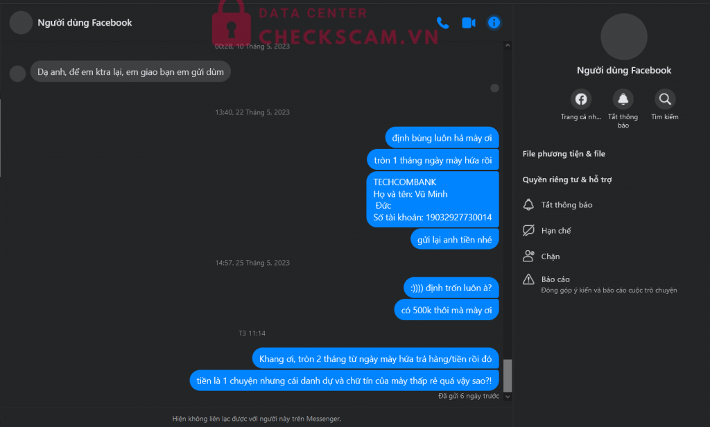Scammer Alert: NGUYEN THANH KHANG Reported: November 16, 2024 Scammer Information Full Name: NGUYEN THANH KHANG Payment Gate: ACB Payment Account: 22035987 Category: Marketplace scams Source: Checkscam Evidence Files Report Description – nhận tiền nhưng không gửi hàng. – Mua bán lừa đảo Comments Your comment Add Comment No comments yet. Be the first to share your experience with this scammer.