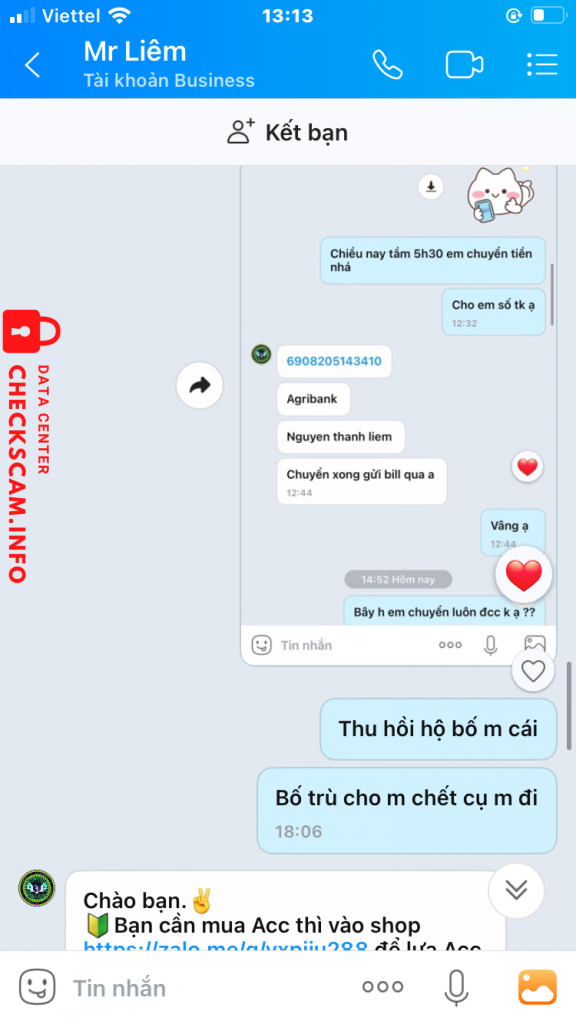 Scammer Alert: Nguyen thanh liem Reported: November 16, 2024 Scammer Information Full Name: Nguyen thanh liem Payment Gate: Agribank Payment Account: 6908205143410 Category: Marketplace scams Source: Checkscam Evidence Files Report Description Lừa đảo 500k, mua nick gửi tài khoản mật khẩu sai, thắc mắc thì bảo mình đổi, xong chặn Comments Your comment Add Comment No comments yet. Be the first to share your experience with this scammer.
