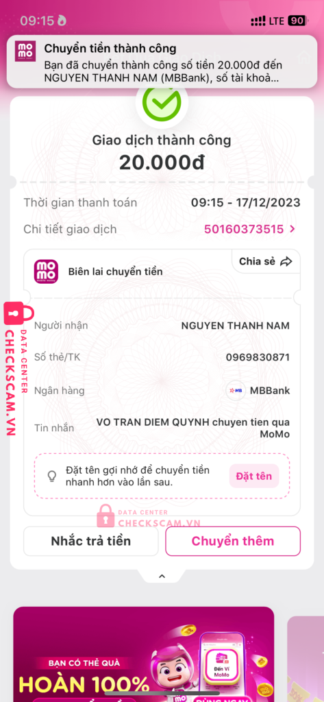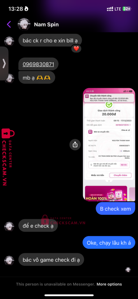 Scammer Alert: NGUYEN THANH NAM Reported: November 16, 2024 Scammer Information Full Name: NGUYEN THANH NAM Payment Gate: MB Bank Payment Account: 0969830871 Category: Marketplace scams Source: Checkscam Evidence Files Report Description Giao dịch mua bán không uy tín Comments Your comment Add Comment No comments yet. Be the first to share your experience with this scammer.