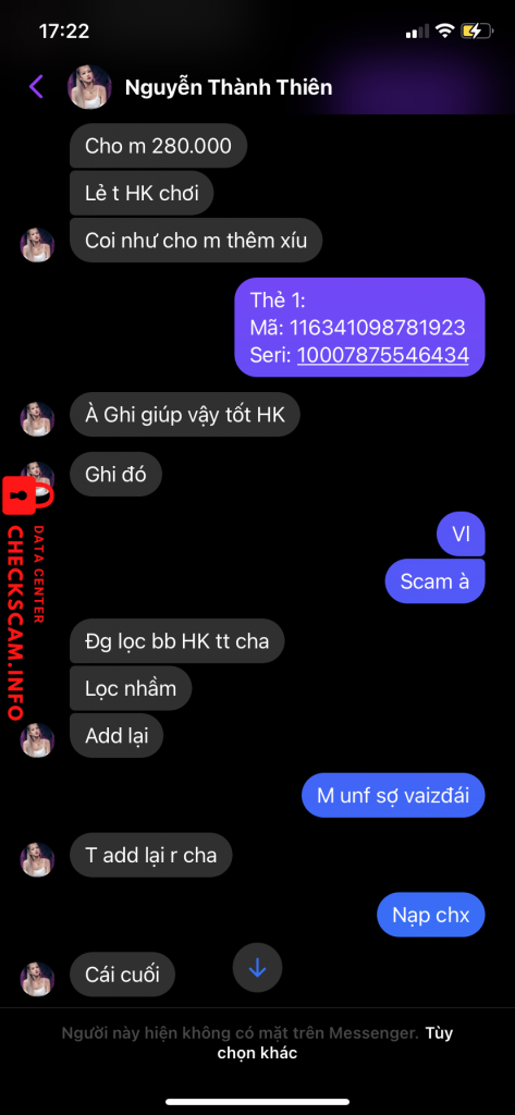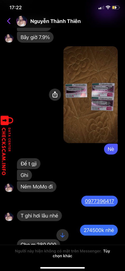 Scammer Alert: NGUYEN THANH THIEN Reported: November 16, 2024 Scammer Information Full Name: NGUYEN THANH THIEN Payment Gate: Mb Bank Payment Account: 0000115621627 Category: Marketplace scams Source: Checkscam Evidence Files Report Description Scam của tôi ghi tôi gạch thẻ Comments Your comment Add Comment No comments yet. Be the first to share your experience with this scammer.