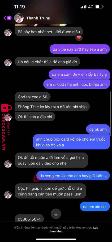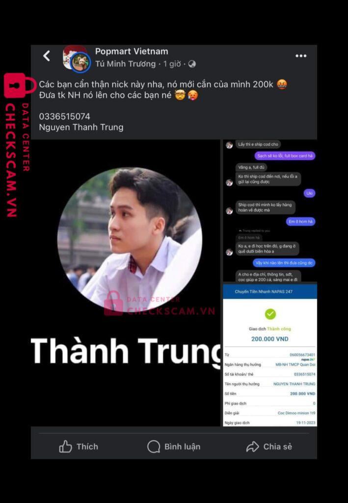 Scammer Alert: Nguyen Thanh Trung Reported: November 16, 2024 Scammer Information Full Name: Nguyen Thanh Trung Payment Gate: MbBank Payment Account: 0336515074 Category: Marketplace scams Source: Checkscam Evidence Files Report Description Lừa đảo trong gruop facebook mua bán sản phẩm blindbox,bắt cọc tiền trước rồi chặn liên hệ người mua Comments Your comment Add Comment No comments yet. Be the first to share your experience with this scammer.