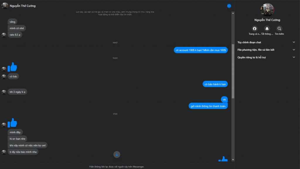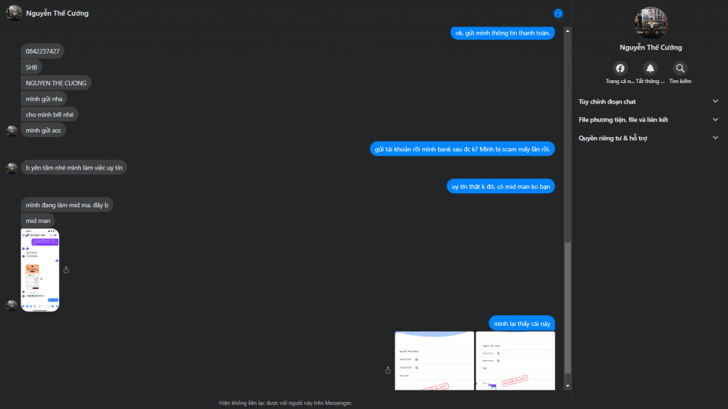 Scammer Alert: Nguyễn Thế Cường Reported: November 16, 2024 Scammer Information Full Name: Nguyễn Thế Cường Phone Number: 0842237427 Payment Gate: SHB Payment Account: 0842237427 Category: Marketplace scams Source: Checkscam Evidence Files Report Description Có ý định lừa đảo mua tài khoản Text Verified, mình vừa gửi ảnh check scam thì thanh niên block mình luôn. Comments Your comment Add Comment No comments yet. Be the first to share your experience with this scammer.