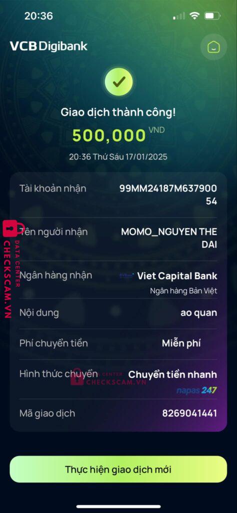 Scammer Alert: Nguyễn Thế Đại Reported: March 7, 2025 Scammer Information Full Name: Nguyễn Thế Đại Payment Gate: Viet Capital Bank Payment Account: 99MM24187M63790054 Category: Marketplace scams Source: Checkscam Evidence Files Report Description lừa đảo, gửi tiền xong nó không giao hàng Comments Your comment Add Comment No comments yet. Be the first to share your experience with this scammer.