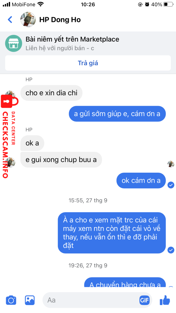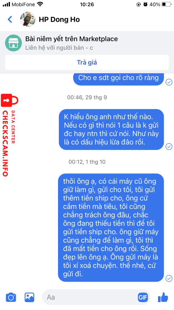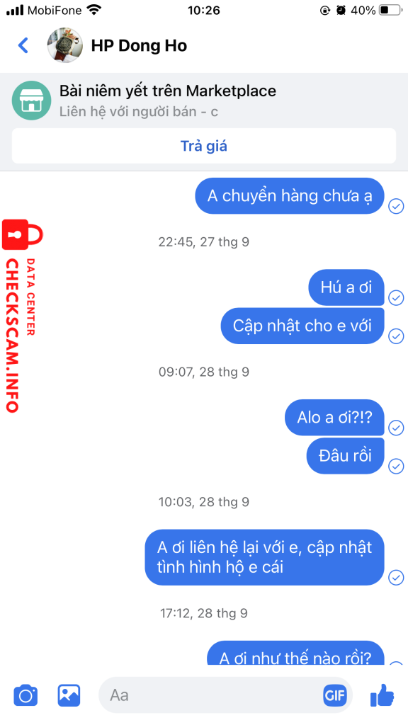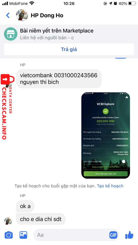 Scammer Alert: Nguyen Thi Bich Reported: November 16, 2024 Scammer Information Full Name: Nguyen Thi Bich Payment Gate: Vietcombank Payment Account: 0031000243566 Category: Marketplace scams Source: Checkscam Evidence Files Report Description Lừa đảo trên chợ marketplace facebook. Bán máy chơi game, nhận tiền xong thì mất tích luôn. Đối tượng ở Hải Phòng. Comments Your comment Add Comment No comments yet. Be the first to share your experience with this scammer.