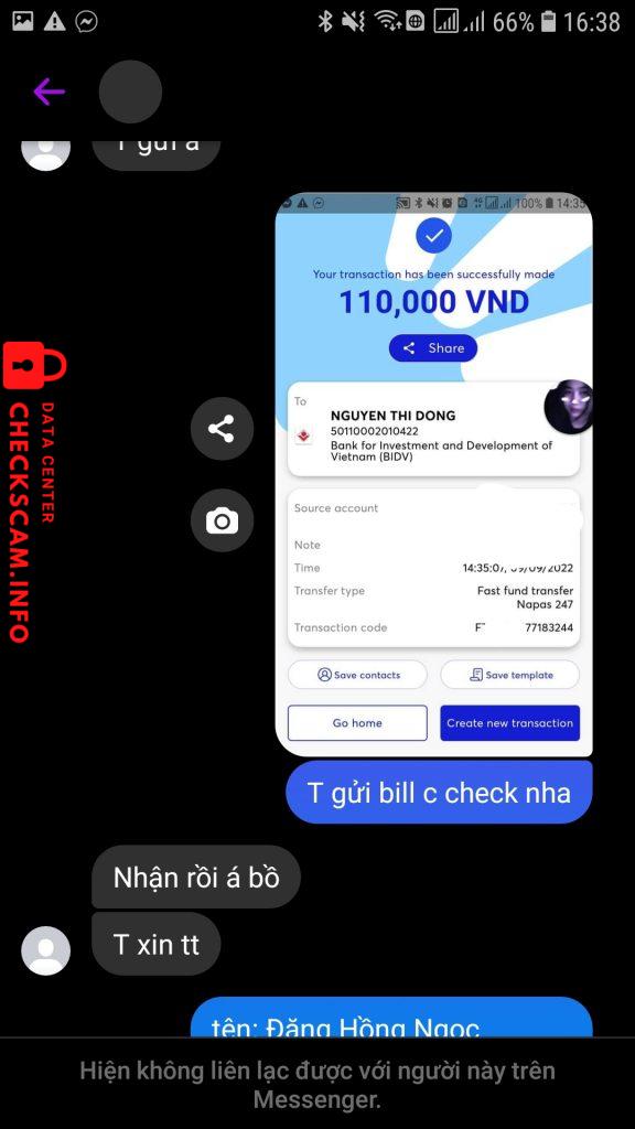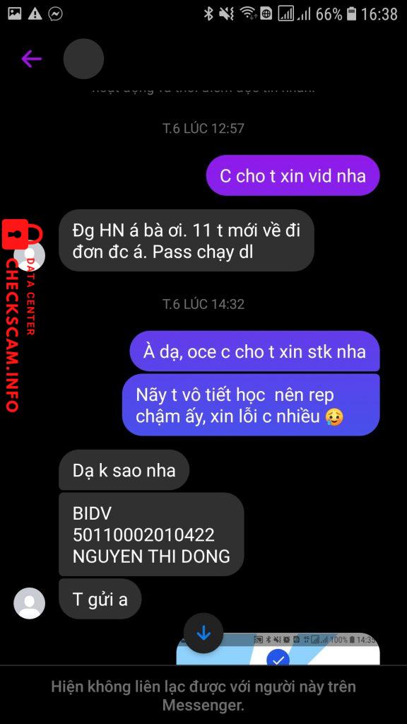 Scammer Alert: NGUYEN THI DONG Reported: November 16, 2024 Scammer Information Full Name: NGUYEN THI DONG Payment Gate: BIDV Payment Account: 50110002010422 Category: Marketplace scams Source: Checkscam Evidence Files Report Description Lấy lí do bán gấp không có video check hàng. Buyer hỏi ngày gửi thì khóa hay block acc gì ấy ạ. Comments Your comment Add Comment No comments yet. Be the first to share your experience with this scammer.