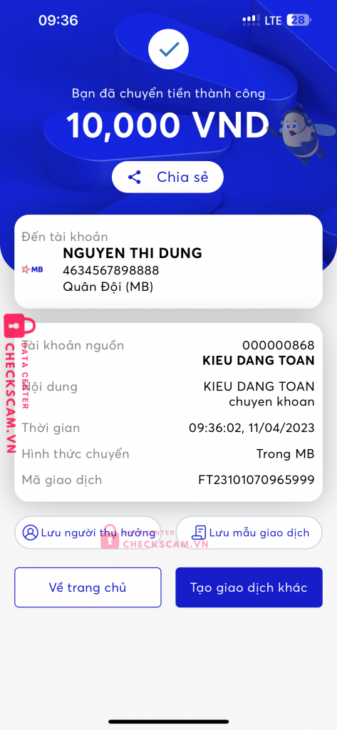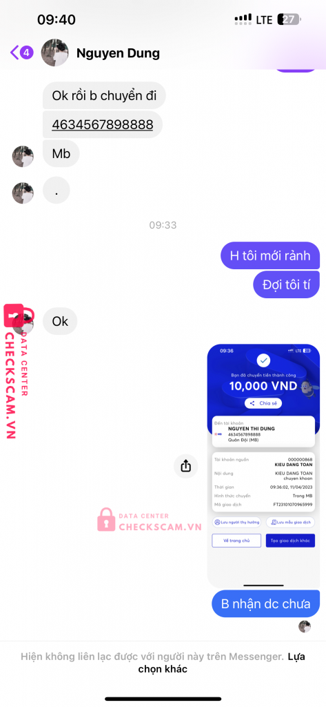 Scammer Alert: NGUYEN THI DUNG Reported: November 16, 2024 Scammer Information Full Name: NGUYEN THI DUNG Payment Gate: MB Bank Payment Account: 4634567898888 Category: Marketplace scams Source: Checkscam Evidence Files Report Description Chuyển khoản xong block Comments Your comment Add Comment No comments yet. Be the first to share your experience with this scammer.