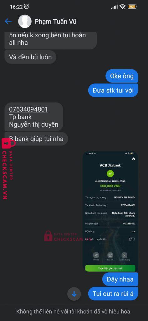 Scammer Alert: Nguyen Thi Duyen Reported: November 16, 2024 Scammer Information Full Name: Nguyen Thi Duyen Payment Gate: TPBank Payment Account: 07634094801 Category: Marketplace scams Source: Checkscam Evidence Files Report Description Thằng này scam nha mn trách xa nó Comments Your comment Add Comment No comments yet. Be the first to share your experience with this scammer.