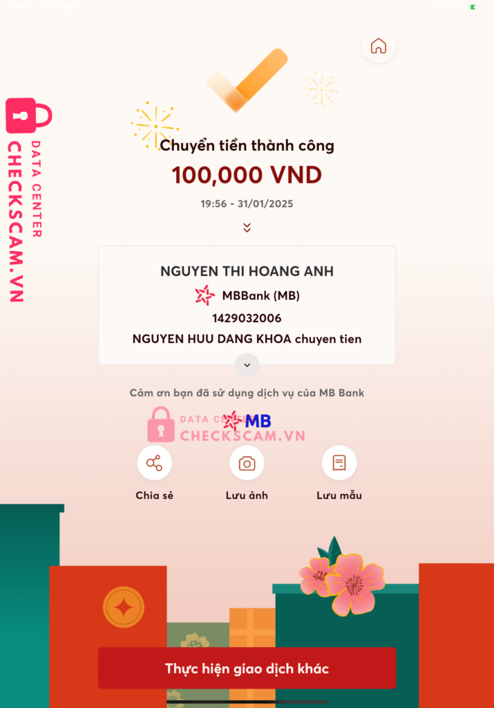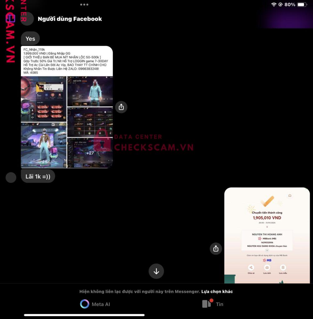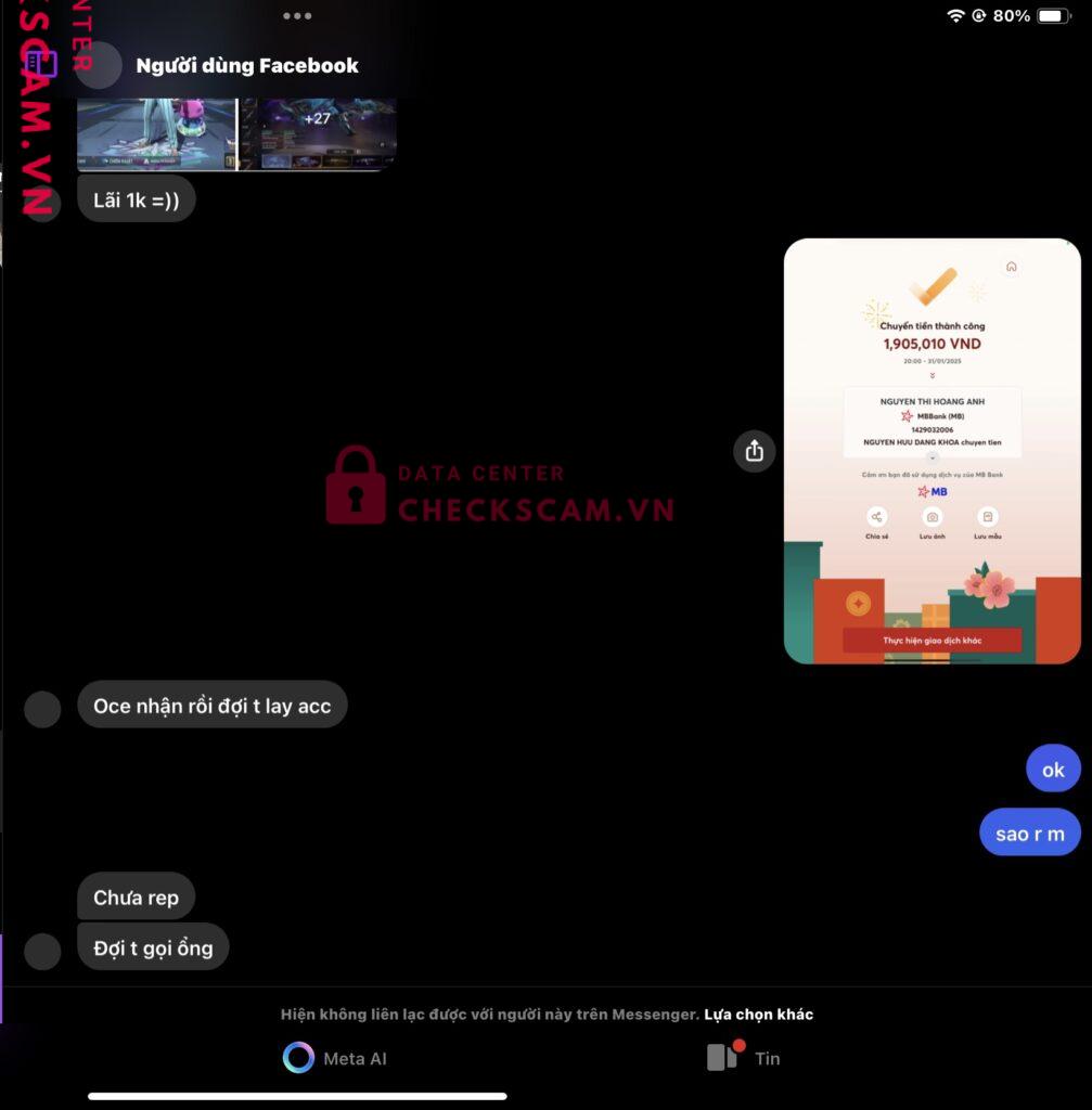Scammer Alert: NGUYEN THI HOANG ANH Reported: March 7, 2025 Scammer Information Full Name: NGUYEN THI HOANG ANH Payment Gate: MBbank Payment Account: 1429032006 Category: Marketplace scams Source: Checkscam Evidence Files Report Description Scam 2triệu khi giao dịch ff Comments Your comment Add Comment No comments yet. Be the first to share your experience with this scammer.