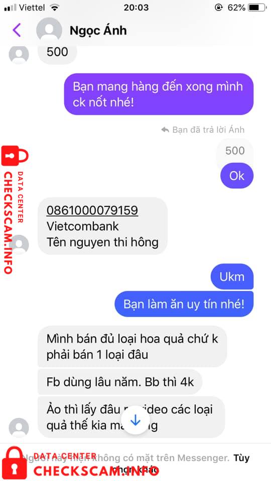 Mn đừng ai bị người này lừa đảo nhé ? nó yêu cầu tôi ck trước tiền cọc 500k tiền hàng, xong nói rất thuyết phục là nick nó lâu năm, gần 4K bb. Lần đầu lấy hàng bên nó tôi ko có kinh nghiệm và ko chụp nick Facebook của nó nên show tạm tên tk + stk + tên ngân hàng của nó ? tôi thấy bức xúc nên show lên đây để mn ko bao h bị nó lừa đảo nữa. Tôi đã rút ra đc bài học là nhận + ktra hàng mới ck ?