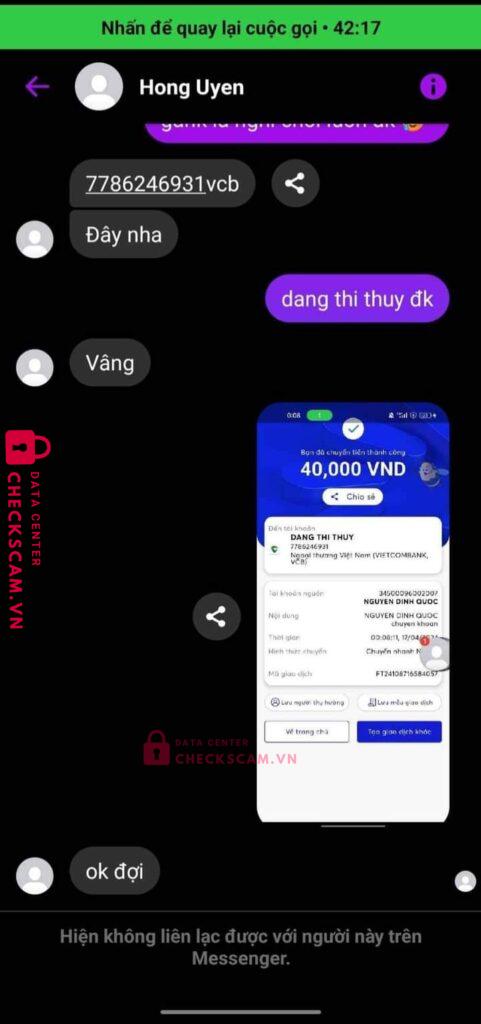 Scammer Alert: Nguyen Thi Hong Uyen Reported: November 16, 2024 Scammer Information Full Name: Nguyen Thi Hong Uyen Payment Gate: Vietcombank Payment Account: 7786246931 Category: Marketplace scams Source: Checkscam Evidence Files Report Description tên Facebook của con này là Nguyen Thi Hong Uyen, nó sử dụng STK của người khác để đi lừa đảo. Comments Your comment Add Comment No comments yet. Be the first to share your experience with this scammer.