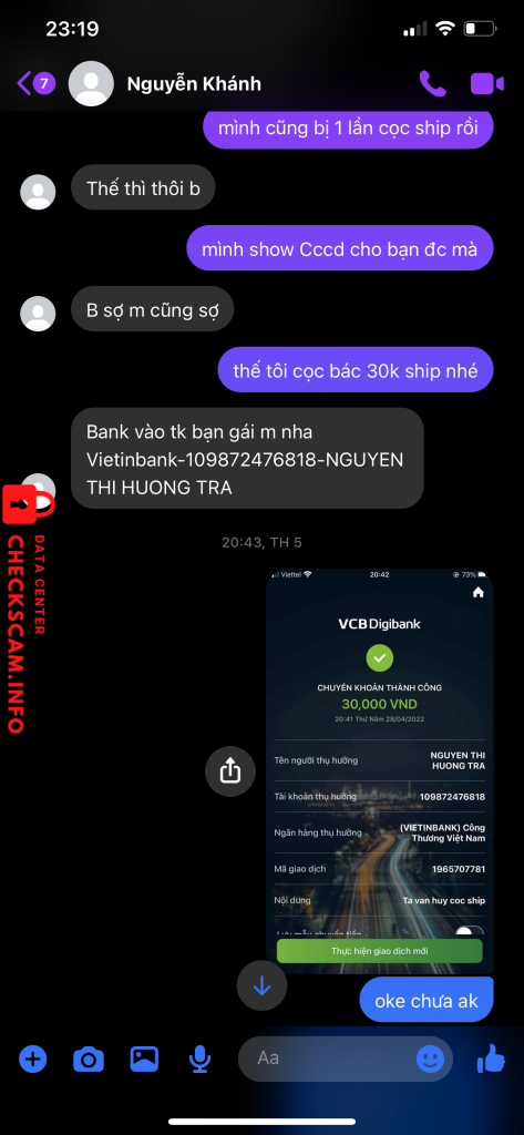 Scammer Alert: Nguyen Thi Huong Tra Reported: November 16, 2024 Scammer Information Full Name: Nguyen Thi Huong Tra Payment Gate: viettinbank Payment Account: 109872476818 Category: Marketplace scams Source: Checkscam Evidence Files Report Description Scam cọc ship :))) rách vl Comments Your comment Add Comment No comments yet. Be the first to share your experience with this scammer.