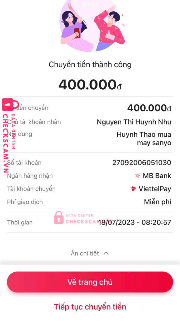 Scammer Alert: Nguyen thi huynh nhu Reported: November 16, 2024 Scammer Information Full Name: Nguyen thi huynh nhu Payment Gate: Mb bank Payment Account: 27092006051030 Category: Marketplace scams Source: Checkscam Evidence Files Report Description Lừa đảo bán hàng. Khi khách chuyển khoản thì chặn Comments Your comment Add Comment No comments yet. Be the first to share your experience with this scammer.