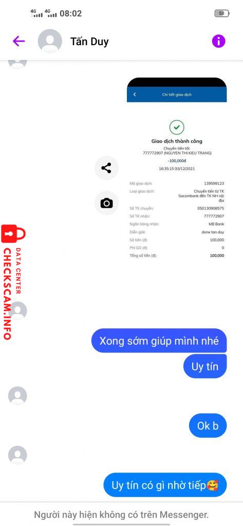Scammer Alert: Nguyen Thi Kieu Trang Reported: November 16, 2024 Scammer Information Full Name: Nguyen Thi Kieu Trang Payment Gate: MB Bank Payment Account: 777772907 Category: Marketplace scams Source: Checkscam Evidence Files Report Description Bank tiền xong block Comments Your comment Add Comment No comments yet. Be the first to share your experience with this scammer.