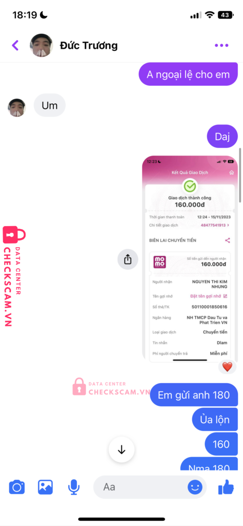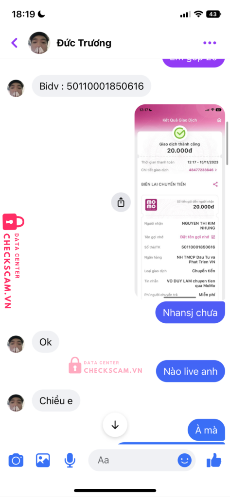 Scammer Alert: NGUYEN THI KIM NHUNG Reported: November 16, 2024 Scammer Information Full Name: NGUYEN THI KIM NHUNG Payment Gate: BIDV Payment Account: 50110001850616 Category: Marketplace scams Source: Checkscam Evidence Files Report Description Bảo hoàn xong không hoàn lươn lẹo lừa đảo ae cẩn thận Comments Your comment Add Comment No comments yet. Be the first to share your experience with this scammer.