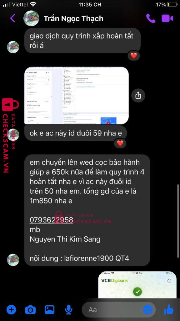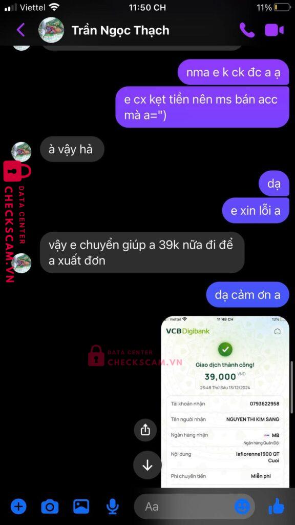 Scammer Alert: NGUYEN THI KIM SANG Reported: March 7, 2025 Scammer Information Full Name: NGUYEN THI KIM SANG Payment Gate: mb bank Payment Account: 0793622958 Category: Marketplace scams Source: Checkscam Evidence Files Report Description Lừa đảo, nhận tiền, xong block Comments Your comment Add Comment No comments yet. Be the first to share your experience with this scammer.