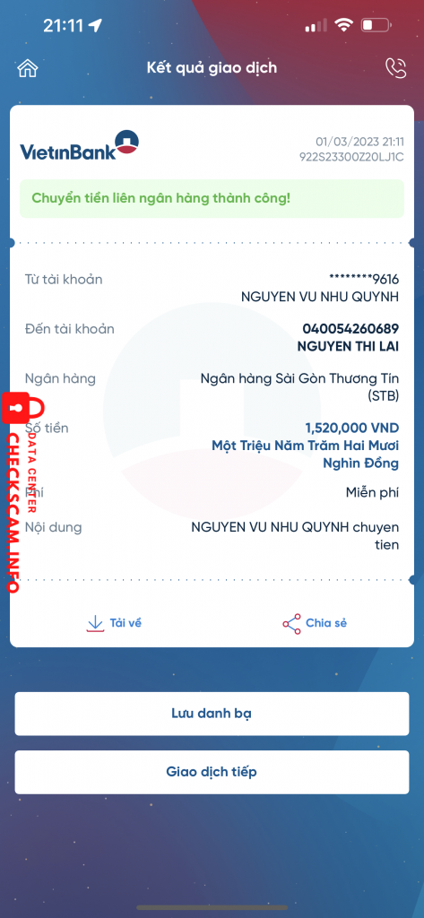 Người này lừa mình bán truyện tranh, năn nỉ mình ck trước vì nhiều lí do. Sau khi ck thì đổi tên fb và hiện tại thì khoá nick mình. Số tiền mình bị lừa là 1 triệu rưỡi.