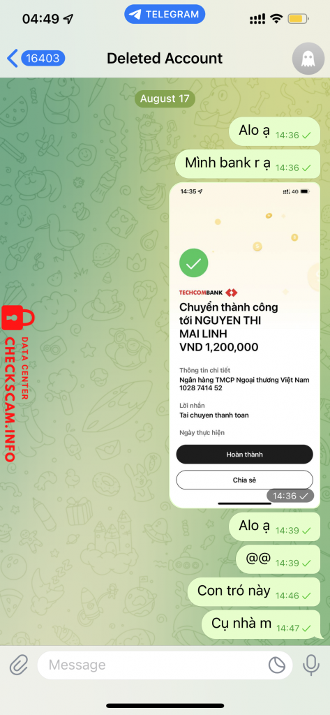 Scammer Alert: Nguyễn Thị Mai Linh Reported: November 16, 2024 Scammer Information Full Name: Nguyễn Thị Mai Linh Payment Gate: Vietcombank Payment Account: 1028741452 Category: Marketplace scams Source: Checkscam Evidence Files Report Description Lừa đảo scan Comments Your comment Add Comment No comments yet. Be the first to share your experience with this scammer.