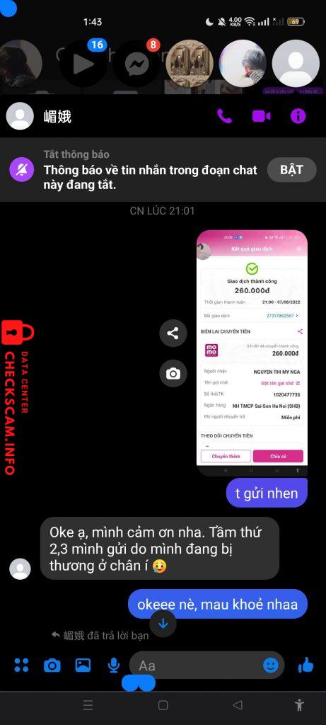 Scammer Alert: Nguyen Thi My Nga Reported: November 16, 2024 Scammer Information Full Name: Nguyen Thi My Nga Payment Gate: SHB bank Payment Account: 1020477735 Category: Marketplace scams Source: Checkscam Evidence Files Report Description #SCAM‼️‼️ đang hốc vì bùn tình còn phải lên bài con này nữa, bị scam quài mệt vcl. Comments Your comment Add Comment No comments yet. Be the first to share your experience with this scammer.