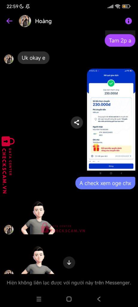 Scammer Alert: NGUYEN THI NGOAN Reported: March 7, 2025 Scammer Information Full Name: NGUYEN THI NGOAN Payment Gate: BIDV Payment Account: 8844224483 Category: Marketplace scams Source: Checkscam Evidence Files Report Description E có mua nhân vật yoshino trong anime adventure của thằng này nhưng sau khi chuyển khoản thì thằng kia nó block. Comments Your comment Add Comment No comments yet. Be the first to share your experience with this scammer.