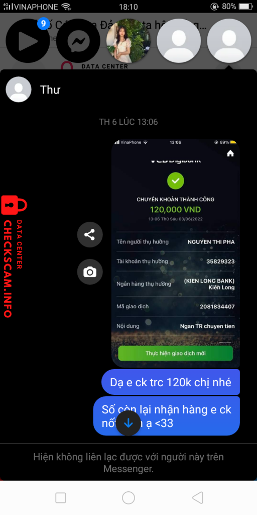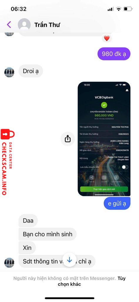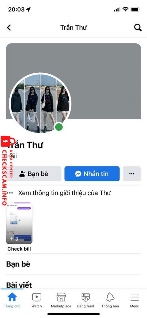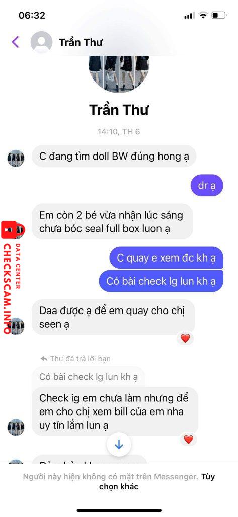 Trần Thư đã tạo nhiều acc clone để lừa người khác trong đó có tôi và 1 người bạn cũng là nạn nhân ạ. May mắn tôi chỉ chuyển khoản cho Thư 50% trước là 120k còn người bạn kia chuyển khoản 100% là 980k. Và còn một người tiếp tay làm bill giả để Trần Thư lấy check uy tín. Xin cảm ơn ạ